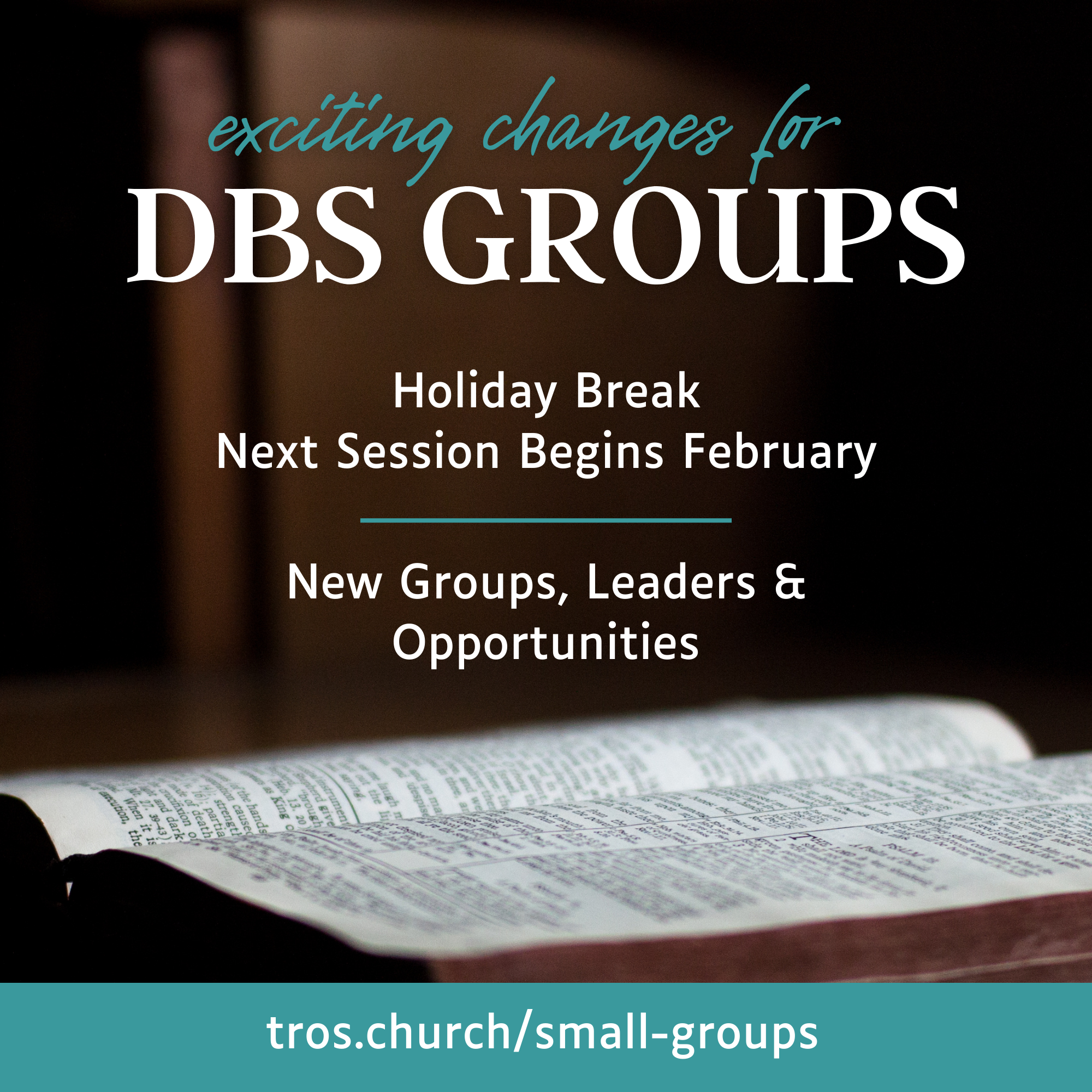 We will be breaking from our DBS Groups during the months of December & January. This break will foster new groups to begin, allow for new leaders to emerge, and give an opportunity for others to experience a different DBS group if interested. Check out all of the current groups below!
